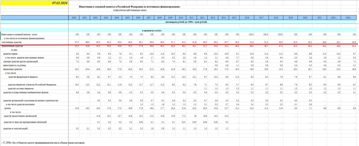 Начиная с 2015 года доля прибыли (собственных средств) компаний как источника финансирования инвестиций стабильно превышает 50%, причем постоянно растет! По итогам 2023 года она составила 55,6%!