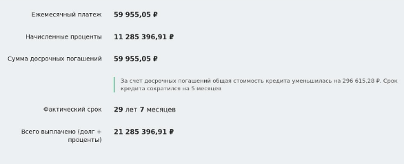 Посмотрите на картинку! Ваши дополнительные 59 905 рублей сократили срок ипотеки на 5 месяцев! А переплата банку сократилась на 296 615 рублей. Поразительно, правда? Но так работает досрочное погашение. Дело в том, что ваш досрочный платеж уменьшил тело долга, на которое начислили бы 180% (6% х 30 лет).
