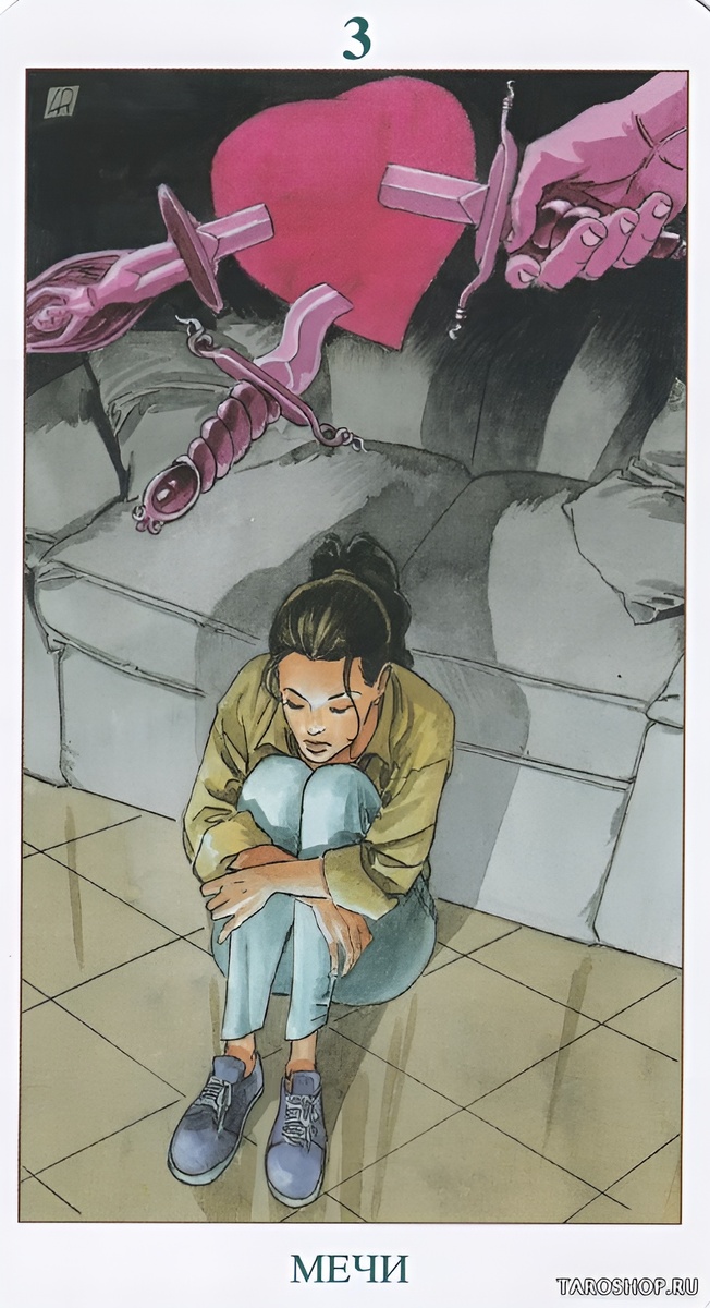 Карта означает рану, нанесенную, возможно, очень близким и любимым человеком, которая привела к разбитому сердца. Обидные слова и болезненные подробности могут ощущаться как мечи, пронзающие сердце. Боль человека может усиливаться по мере того, как человек будет осознавать реальность ситуации, даже если он надеялся на другой исход. Наверняка он всё понимал умом, но душевно он надеялся на обратное. Возможно, у человека еще нет четкого понимания причин и следствий своего горя, поскольку эмоции пока берут верх над разумом. У человека разрушились иллюзии, за которые он так цеплялся.