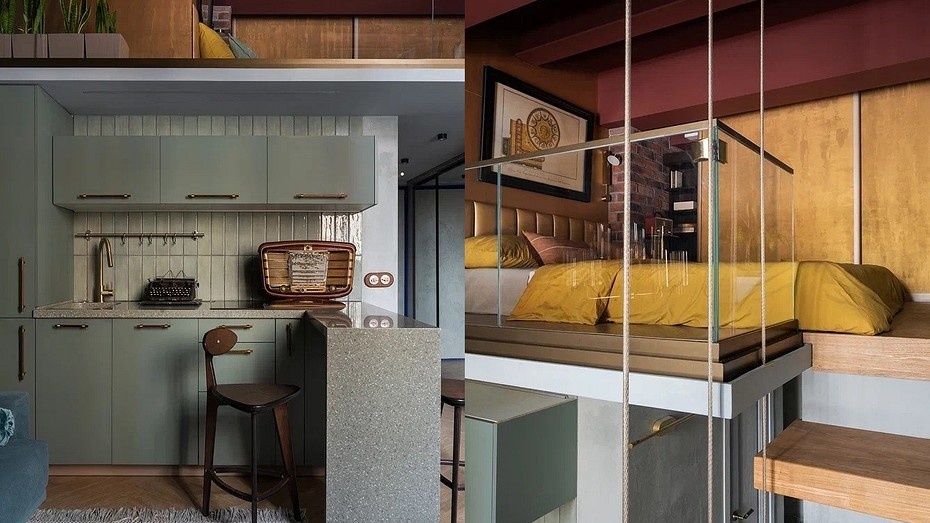 Для реализации своих непростых идей — создания атмосферного интерьера с присутствием любимых зеленых оттенков и уединенной спальней на антресоли — заказчица обратилась к архитектору. В маленькой квартире ей также требовалось много мест хранения и обязательно ванна, а не душ.