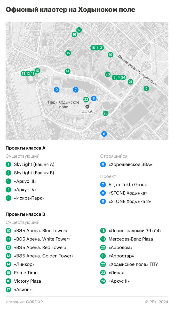 По информации NF Group, рядом с Ходынским полем построены такие БЦ класса А, как «Аркус III» (34,3 тыс. кв. м), «Аркус IV» (18,1 тыс. кв. м), и класса B — «Аэродом» (30,9 тыс. кв. м), «Аркус II» (7,7 тыс. кв. м), «Линкор» (34, 0 тыс. кв. м) и «ВЭБ Арена» (48,6 тыс. кв. м). «В целом в рассматриваемой зоне развит девелопмент офисных проектов, среди последних новых заявленных — «Stone Ходынка» (70 тыс. кв. м офисов), «Stone Ходынка 2» (58 тыс. кв. м) и «BusinessClub Ходынка» (10 тыс. кв. м)», — рассказали в NF Group.