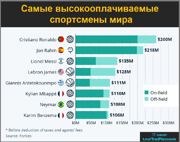 Бывший игрок Реал Мадрид К.Рональдо самый высокооплачиваемый спортсмен мира. Гольфист Джон Рам из Испании номер 2.