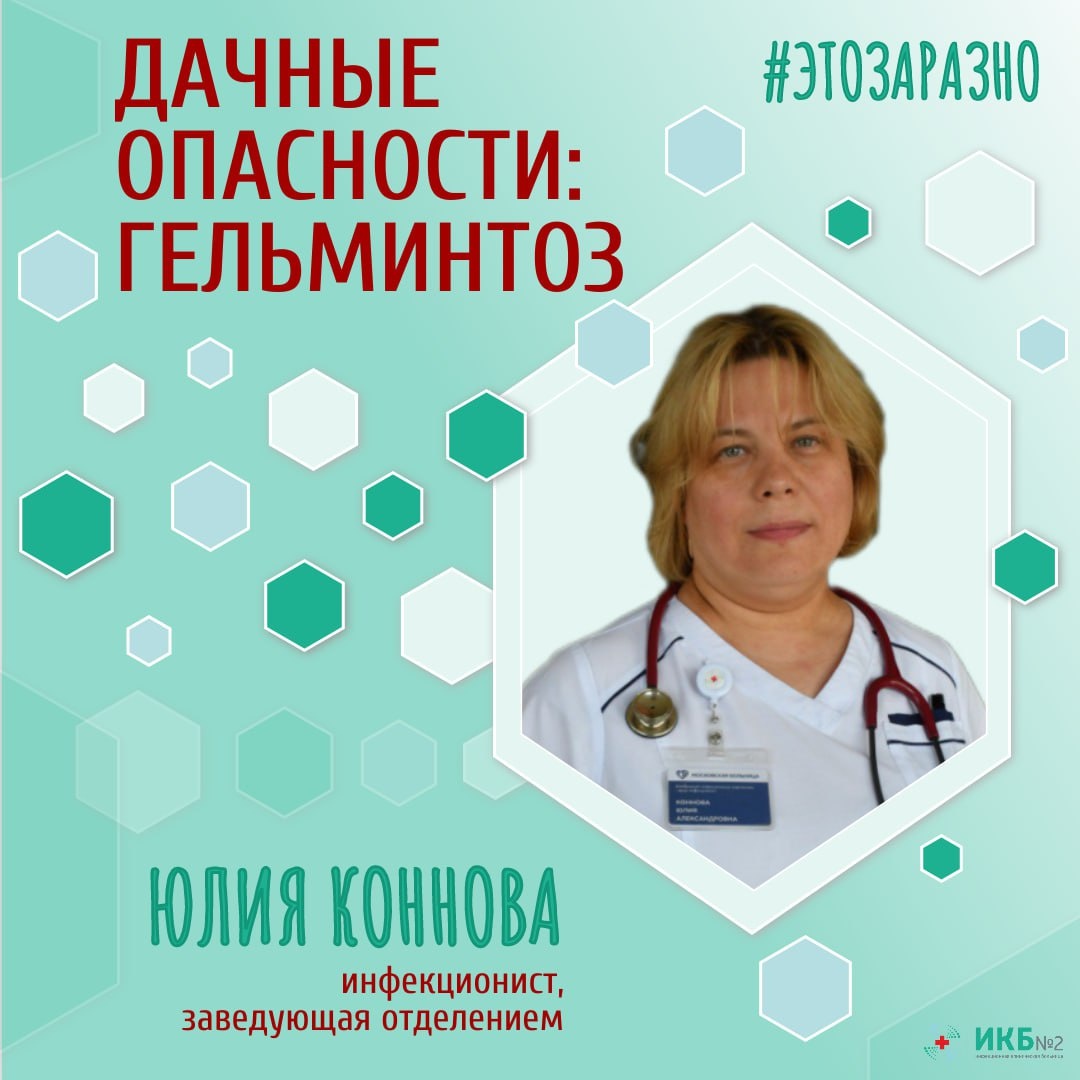 Продолжаем говорить о «дачных» инфекциях. Недавно мы рассказали, как защититься от боррелиоза, а сегодня разберемся, что такое гельминтоз. Поможет в этом врач-инфекционист, заведующая 14 отделением Юлия Коннова. «Гельминтоз – это инфекция, вызванная гельминтами (глистами). Чаще всего заражение этими заболеваниями людей, отдыхающих на даче, происходит при контакте с инфицированными животными, почвой и водой, а также при употреблении зараженных гельминтами продуктов питания (рыбы, мяса, овощей, зелени). Кроме того, личинки паразитов могут поджидать вас в открытых водоемах, где обитают водоплавающие птицы. Гельминтоз может проявлять себя как острая кишечная инфекция, аллергия (сыпь, дерматит, экзема) и протекать с такими симптомами, как быстрая утомляемость, бессонница, боль в мышцах и суставах, отеки, желтуха. Опасность гельминтоза заключается не столько в его неприятных симптомах, сколько в возможных осложнениях. К серьезным осложнениям относятся: кишечная непроходимость, желудочно-киш