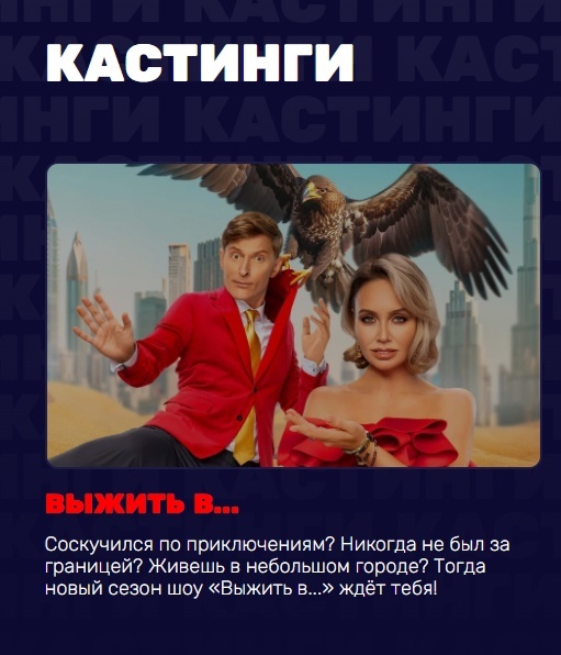 Телеканал «ТНТ» объявил кастинг в новый сезон шоу «Выжить в …» Соскучился по приключениям? Никогда не был за границей? Живешь в небольшом городе? Тогда новый сезон шоу «Выжить в…» ждёт тебя! Не важно где ты работаешь и кем мечтал стать в детстве. Нам нужны только твое желание и готовность пройти все испытания шоу! Заполни анкету, приложи ссылку на видео с рассказом о себе, увлечениях и на что ты готов потратить многомиллионный выигрыш. В шоу могут принимать участие лица от 18 до 40 лет, которые никогда не были за границей.