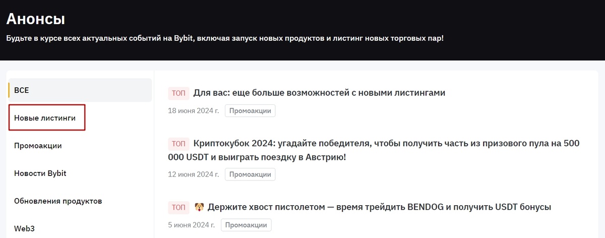 Листинг на Байбит, как и на любой другой бирже - это дата официального добавления токена в торги на платформе. С указанного дня трейдеры могут покупать и продавать объявленную криптовалюту бирже. Дату листинга важно знать, чтобы совершить торговые операции с токеном на самых выгодных условиях. Например, весной 2024 года все следили за NOTCOIN. А уже в июне - июле 2024 в сети растет количество запросов - когда листинг хомяка (Hamster Kombat) на ByBit или других платформах. Отмечу, что перед добавлением нового токена в торговые пары на бирже проводят проверку и анализ новой монеты. Среди большого списка проверок выделим следующие: Иногда случается так, что до листинга случается прелистинг монеты на ByBit. Если появилась информации о нем, то значит совсем скоро токен зачистят и откроют торги. Самое время зарегистрировать аккаунт на ByBit и пройти верификацию. А чтобы получить бонусы при регистрации и скидки на торговые комиссии советуем использовать реферальный код: 8YYVWL или реф. ссылку
