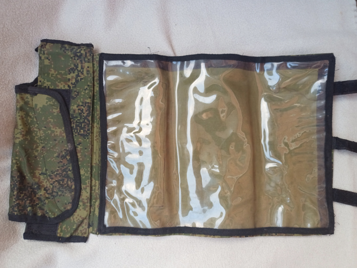 Разработали и сшили ещё до СВО вот такой нарукавный планшет под карту. Единственный экземпляр на данный момент. Предполагалось, что упростит работу в группах разведки артиллерийских корректировщиках, что в итоге и вышло. В нутро планшета вставлялась карта, сложенная вверх необходимой обстановкой, и одевалась на руку. Использовался на полигоне во время учений и первых два месяца в ходе СВО. Но потом, из-за ненадобности и применения электронных карт, был снят с использования. Как думаете, ещё пригодится?