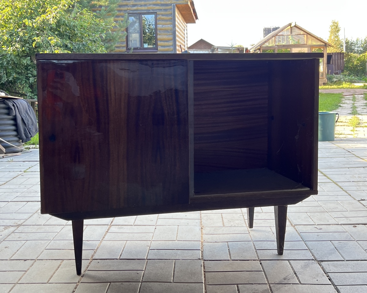 По задумке советских дизайнеров у тумбы есть глухая дверка и вторая часть закрывается стеклом. И стекло и глухая дверка ездят по полозьям. Стекло, конечно, не сохранилось.