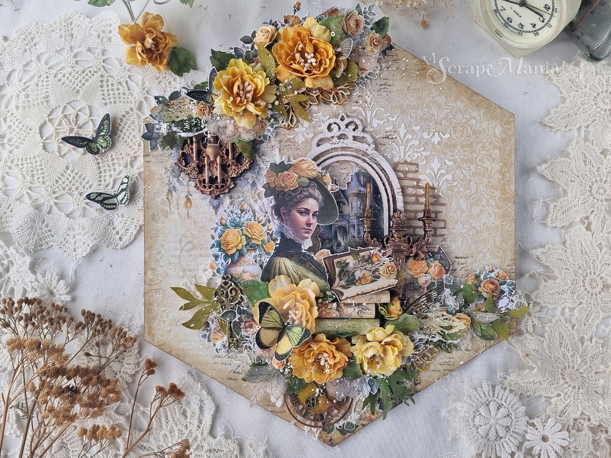 Доброго дня, дорогие творческие друзья! Сегодня я, Татьяна Авдеева, хочу поведать вам историю про красивую аристократку прошлых веков. Уже будучи повзрослевшей женщиной, она вернулась в родовое имение, где ее встречают родные стены старинного замка. Молодая женщина гуляет по тропинкам сада, утопающего в пышности медово-желтых роз, зажигает свечи в массивных бронзовых канделябрах, слушает звуки старых часов и с трепетом в сердце вспоминает свое детство и юность. Она берет в библиотеке книги, прочитанные ею в юности, листает их и наслаждается тишиной, спокойствием и чашечкой английского чая из дорогого фарфора. В работе я использовала лист "Затерянная среди роз. Канделябр" из набора бумаги 30,5х30,5см коллекции "Затерянная среди роз". Форму для панно я выбрала шестиугольника. Просто обрезав у странички углы. Лист наклеила на плотный картон, чтобы страничка не прогибалась от декора. По краю затонировала дистрессами, чтобы придать объема. Так как страничка называется "Канделябр", то нас