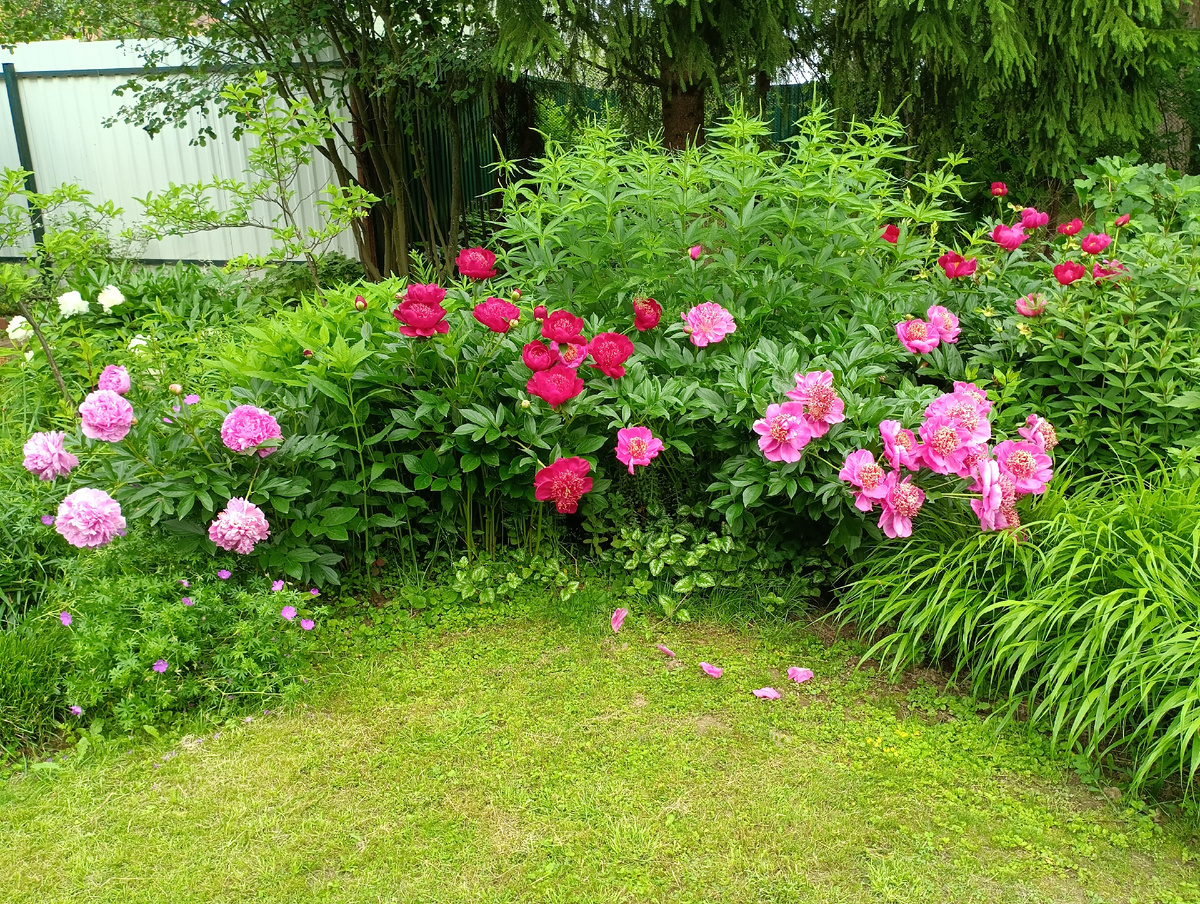 Пролетела неделя, и прошлые пионы ушли в небытие. На смену им на сцену выступают пионы более позднего срока цветения. Даже не знаю, кого из них я люблю больше. Наверное, как в семье, всех одинаково, но каждого по-своему) Ну разве можно выбрать тот сорт, который предпочитаешь больше всего, ведь все красавцы! И я ещё не стала фотографировать тех торопыг, которые и распустились, и закончили цветение в моё отсутствие. Жалко, что всё так быстро проходит, а что делать?! Тут вон жизнь промелькнула - не заметила как десятки годков насчитала. А вы говорите, цветы) Закон природы, и ничего тут не попишешь. Время не стоит на месте, и нас погоняет. Да и мы всё спешим, всё чего-нибудь ждём: то лета, то Нового года, следом новой весны. А ведь не думаем, что один такой цикл - это целый прошедший год! Ого, как проскочил, и не заметили за своими ожиданиями. А годы-то, вы тоже это ощущаете, всё скорей мелькают? И так хочется иногда остановить миг, недельку, ну хоть лето! Жаль, неподвластно это нам. И тут