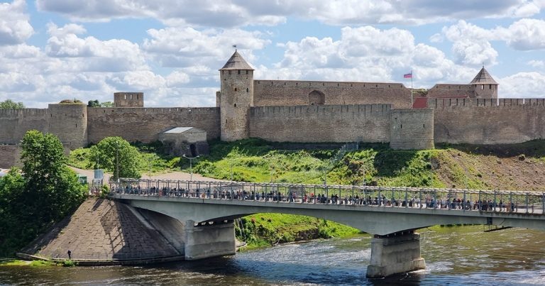 В проводах важными доминантами становятся крепость и замок — с них открывается вид «на другую сторону реки» и можно видеть, успешно ли родные переходят границу. А сегодняшний переход славится своими многочасовыми очередями в обе стороны, ведь с эстонской стороны теперь идут еще и те, кто раньше выбирал финско-российскую границу, но из-за закрытия пропускных пунктов вынуждены идти в обход.