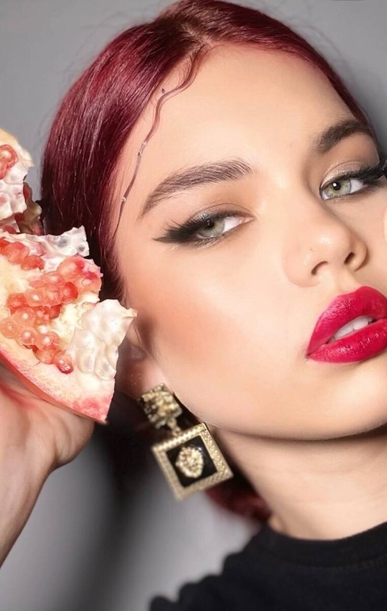 Привет! Пригласила Аню к себе моделью, чтобы поснимать творчество, и цвет её волос натолкнул меня на одну очень интересную идею. Я подумала, а почему бы нам не сделать «гранатовый» образ, с акцентом одновременно и на губы, и на глаза. А также решила купить гранат для сочности и яркости фото. Честно признаться, я не могла однозначно решить, глаза или губы в данном макияже будут акцентными, поэтому я решила сделать и растушеванную стрелку, и яркие ягодные губы. Что скажете насчет этого образа?