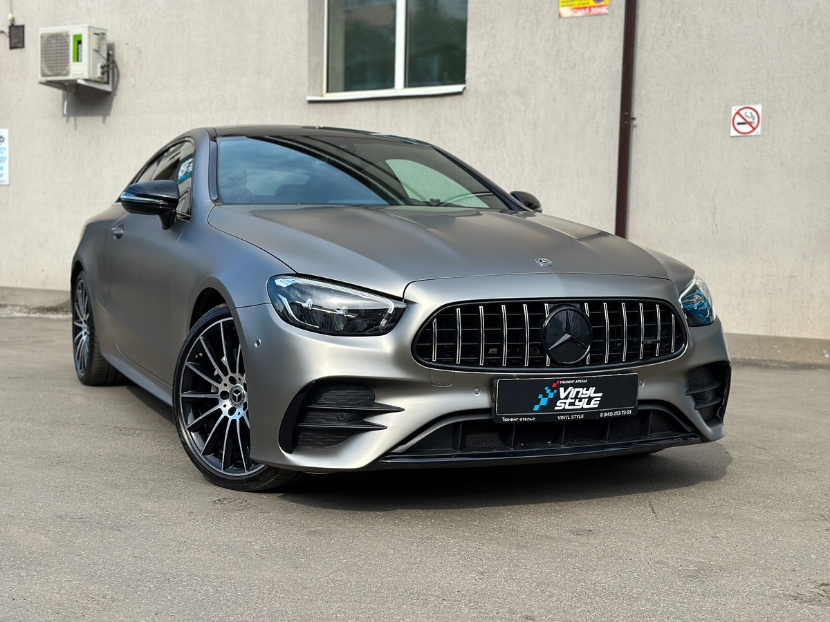 Бронирование Mercedes E200 цветной матовой полиуретановой плёнкой. 2 в 1: защита кузова от сколов и царапин + преображение.