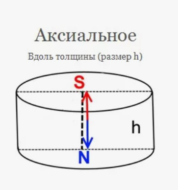 Аксиальное намагничивание происходит вдоль оси магнита, перпендикулярно к поверхности. Это типично для дисков, цилиндров, стержней, колец, трубок. В этом случае магнитное поле направлено вдоль оси магнита.