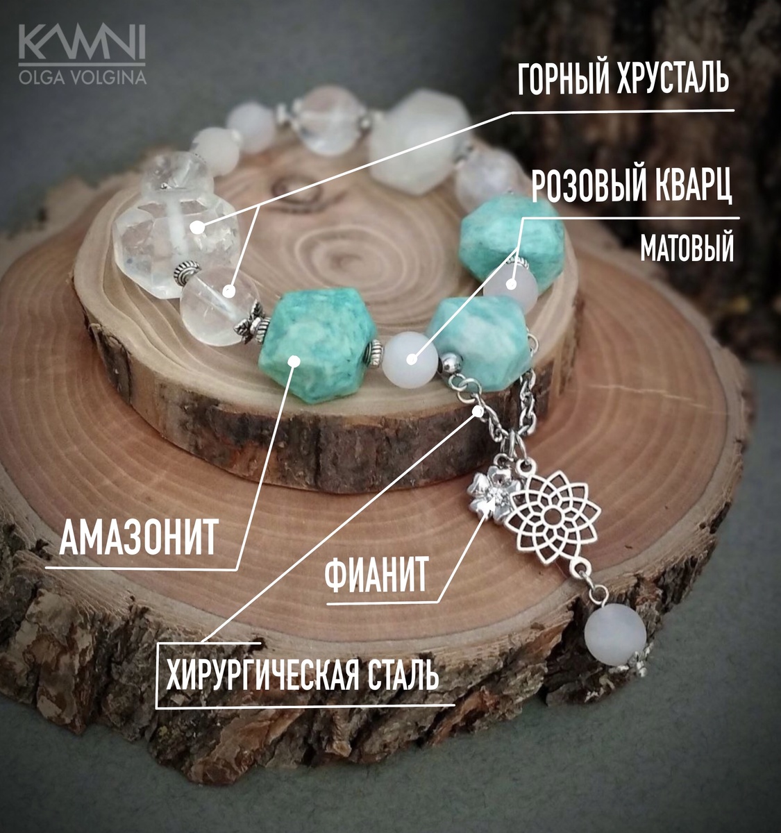 Амазонит + горный хрусталь + розовый кварц. Браслет про ясность мысли и способность столь же ясно выразиться вслух. Слышать собеседника и быть услышанным. Отлично помогает найти общий язык, особенно в отношениях. Кроме этого, оба эти камня способствуют переменам, в том числе, пополнить круг общения и привлечь в свою жизнь приятных, достойных людей. Розовый кварц в этом браслете добавит мягкости и нежности в общении. А еще матовое покрытие бусин розового кварца позволит кАпнуть любимый аромат эфирного масла и зАпах продержится несколько дней.