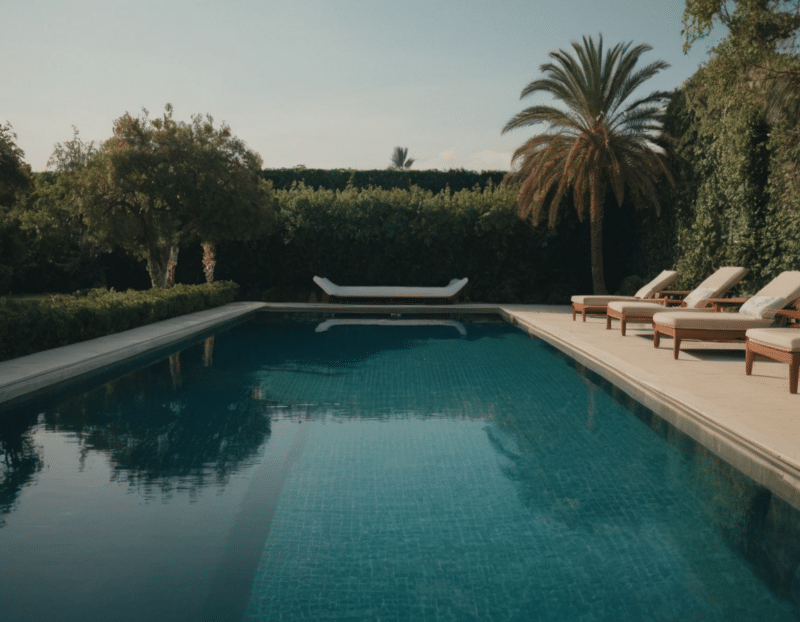Прилегающая территория и дорожки Согласно нормативной документации, периметр земельного участка с открытым бассейном следует засаживать растениями (декоративными кустарниками, хвойными породами деревьев) полосой не менее 5 метров в ширину. Также прилегающая территория должна содержать хозяйственную зону с отдельным въездом, ширина подъездных путей регламентируется СП 59.13330.