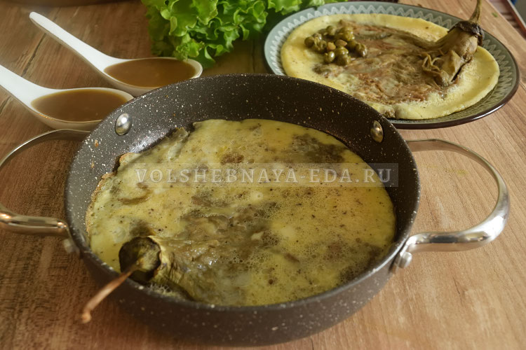 Неожиданно интересный омлет получается из баклажана. Идея проста: запекаете овощ на гриле или в духовке, очищаете от кожицы, оставляя хвостик, расплющиваете на сковороде и заливаете омлетной смесью. Особенно вкусным омлет получается из совсем молоденьких и небольших баклажанов. Омлет Соус: Запечь баклажан до полной мягкости в заранее разогретой до 200 гр. духовке. У меня были небольшие баклажаны, им для этого хватило 15 минут. Очистить от шкурки, но оставить хвостики. В разогретой сковороде растопить немного масла — растительного, или смеси растительного и сливочного (омлетам идет сливочное масло!), размять баклажаны вилкой, распластав их по всей сковороде. Лучше использовать небольшую сковородку для омлетов (здесь d=18 см), и баклажаны купить примерно того же размера. Но даже если ваша сковорода будет больше, на вкусе это не отразится. Подготовить яичную смесь: взболтать яйца (для каждого баклажана болтушку из 2-х яиц я готовила отдельно), посолить, поперчить, можно влить несколько л