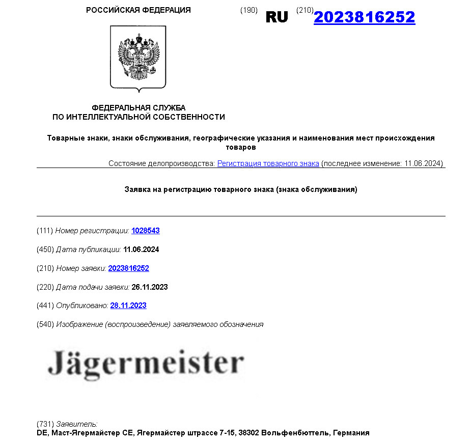 Роспатент зарегистрировал новый товарный знак для немецкого производителя ликеров Jägermeister, который ушел из России в 2022 году. На это 18 июня обратило внимание издание RTVI в своем Telegram-канале. Согласно данным из реестра Федеральной службы по интеллектуальной собственности, товарный знак Jägermeister был зарегистрирован 11 июня, а заявку компания из немецкого Вольфенбюттеля подала 23 ноября 2023 года. В перечне товаров, помимо алкогольных напитков, указаны безалкогольные напитки, сиропы, а также одежда, обувь и головные уборы. Компания Jägermeister официально прекратила поставки своей продукции в Россию в ноябре 2022 года. С 2023 года фирма судилась с калужским ликеро-водочным заводом «Кристалл» из-за похожего оформления бутылок травяного ликера его производства. В конце 2023-го «Кристалл» выиграл два арбитражных суда по искам Mast-Jagermeister SE, а затем подал встречный иск о защите деловой репутации, но позже отказался от него. В марте 2024 года компании подписали мировое с