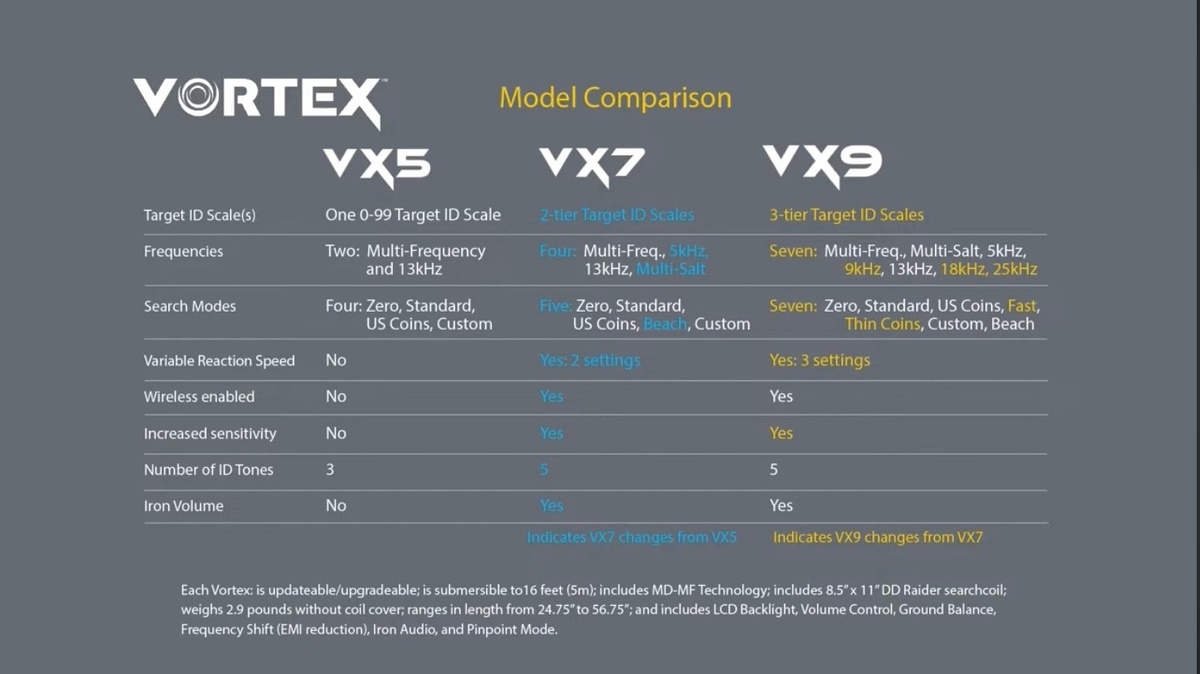 Ниже прикрепляю сравнительная таблица трёх моделей нового. Довольно компактный и имеет не стандартный цвет, но прикольный. Очень хорошо, что Garrett Vortex имеет расширенную комплектацию поисковых катушек и наушников. И одно из самых главных - то, что он подводный. В нынешнее времена универсальный прибор. То, что надо. В ближайшее время расскажу вам про все его характеристики. Так то вообще производитель говорил что весной уже будут тестовые Garrett Vortex. Но видимо что то дорабатывали и по этому сроки передвинулись.