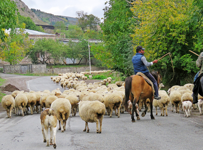 Горис стоит в развилке трёх дорог - вниз по реке на Иран, с правого берега - на Ереван, с левого - на Степанакарет, и на момент моей поездки эта дорога была ещё актуальна. Узкая, крутая и извилистая карабахская трасса, по которой в конце сентября ещё и куда-то гнали стада, совсем не похожа на "дорогу жизни" непризнанного государства, единственную аж до 2017 года: Начинаясь на неприметной окраине, она петляет среди полумёртвых промзон: Но порой на сгибах серпантина открываются совсем иные виды, пробуждающие в голове единственное слово - Каппадокия. Как и большую часть Армянского нагорья, Арташенскую равнину построили древние вулканы, которым снова извергаться давно не суждено. Только стройматериал здешние огнедышащие горы выбрали другой - вместо более привычной лавы, в которой под Гарни, Ехегисом, Гндеванком или Сисианом реки вырезали столбчатые скалы, здесь в дело пошёл туф. Мягкий и хрупкий, он был податлив и текущей воде, и ударам кайла, а как результат, к востоку от Гориса ручьи по