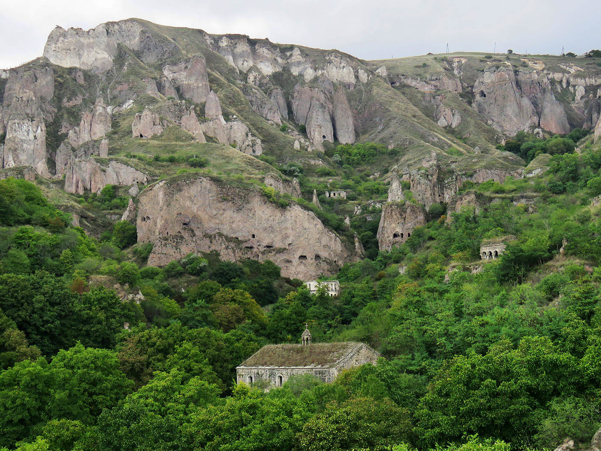 Но порой на сгибах серпантина открываются совсем иные виды, пробуждающие в голове единственное слово - Каппадокия. Как и большую часть Армянского нагорья, Арташенскую равнину построили древние вулканы, которым снова извергаться давно не суждено. Только стройматериал здешние огнедышащие горы выбрали другой - вместо более привычной лавы, в которой под Гарни, Ехегисом, Гндеванком или Сисианом реки вырезали столбчатые скалы, здесь в дело пошёл туф. Мягкий и хрупкий, он был податлив и текущей воде, и ударам кайла, а как результат, к востоку от Гориса ручьи построили бесчисленные скалы-"пирамиды", превращённые людьми в дома-"каратаки" ("подкаменки"), дупла каменных лесов: