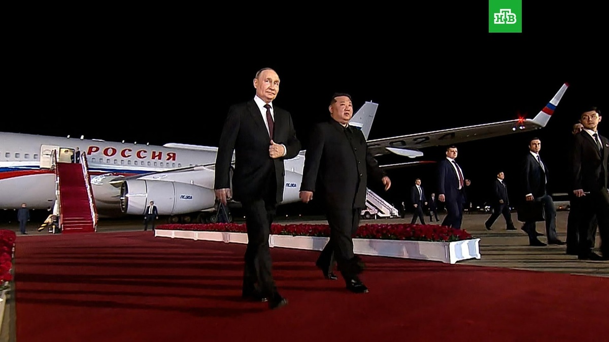 [ Смотреть видео на сайте НТВ ] Появились кадры прибытия Владимира Путина в КНДР. В аэропорту Пхеньяна Владимира Путина встретил Ким Чен Ын. Лидеры двух стран сначала пожали друг другу руки, а потом обнялись и обменялись несколькими фразами. Девушка в национальном платье ханбок преподнесла Путину букет цветов. Затем лидеры в Aurus российского президента проехали по ночному Пхеньяну в государственную резиденцию Кымсусан, куда зашли вместе. Сегодня Владимир Путин начал свой первый с 2000 года визит в КНДР. 19 июня президент России проведет переговоры с Ким Чен Ыном, будут подписаны несколько соглашений, в том числе договор о всеобъемлющем стратегическом партнерстве. Также Путин и Ким Чен Ын посетят торжественный концерт. Запланировано возложение венка к монументу «Освобождение», посвященному воинам Красной Армии, и православного храма. После этого президент отправится во Вьетнам. [ Смотреть видео на сайте НТВ ]