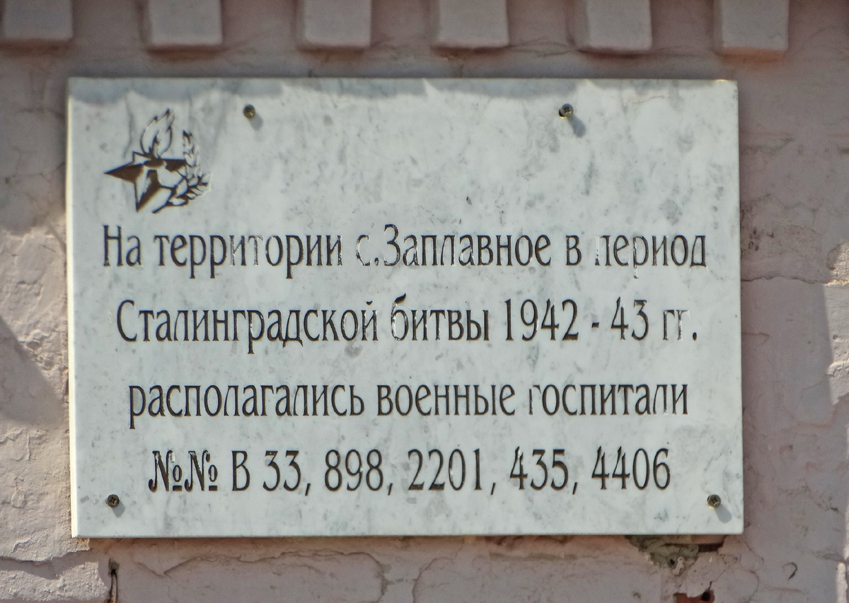 В предыдущей статье речь была о братской могиле павших в боях Гражданской войны, которая расположена в селе Заплавном, что в Ленинском районе Волгоградской области. В Гражданскую тут шли серьёзные бои, в районе села воевал даже будущий маршал Г.К. Жуков. Но спустя годы война снова пришла в село и оставила свой страшный след в виде ещё одной братской могилы. Речь конечно же идёт о Великой Отечественной войне, а если конкретно, о Сталинградской битве. Братские могилы павших в боях за Сталинград есть, наверное, в каждом населённом пункте нашей области, село Заплавное исключением не стало. Селу повезло, боёв тут не было, линия фронта сюда не дошла, хотя и была не очень далеко. От центра села до северной части Волгограда по прямой всего чуть больше 30 километров. Так что это был ближний тыл. Наверняка жители села слышали артиллерийскую канонаду, гремевшую в Сталинграде, сюда долетали бомбардировщики люфтваффе. А самое главное, тут были госпитали. Об этом нам говорит табличка на стене здания