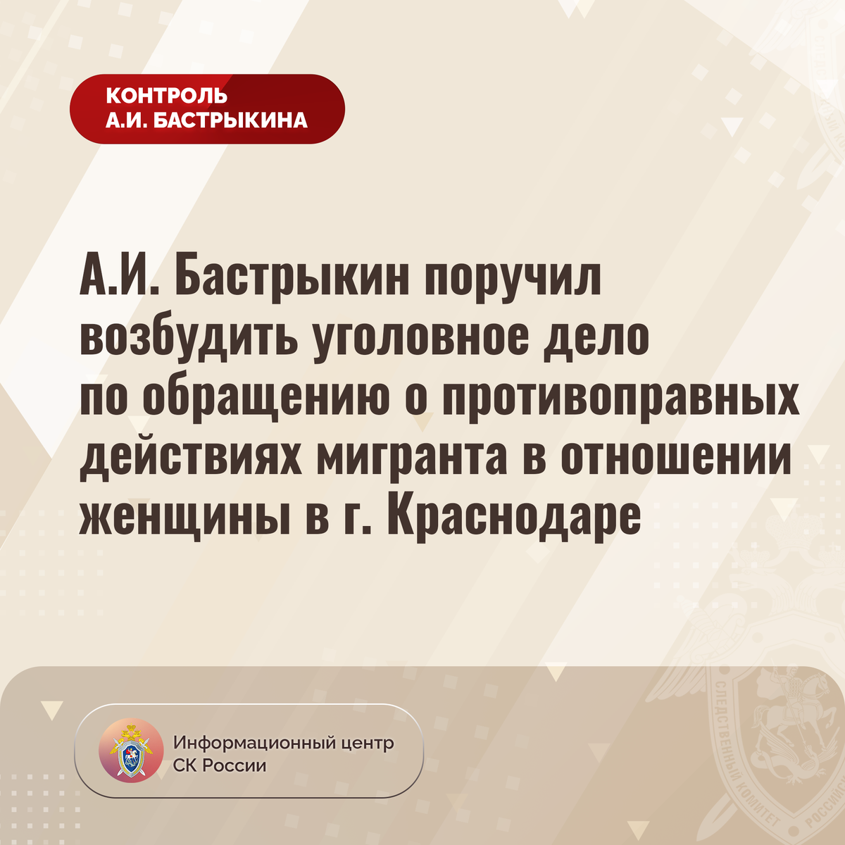 А.И. Бастрыкин поручил возбудить уголовное дело по обращению о противоправных действиях мигранта в отношении женщины в г. Краснодаре