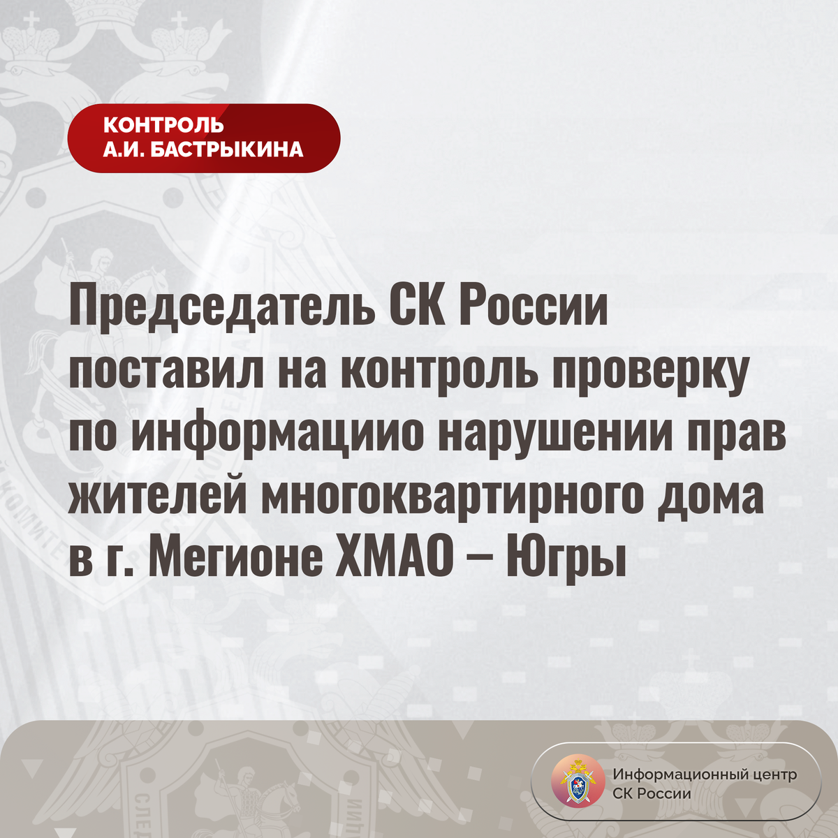 Председатель СК России поставил на контроль проверку по информации о нарушении прав жителей многоквартирного дома в г. Мегионе ХМАО – Югры