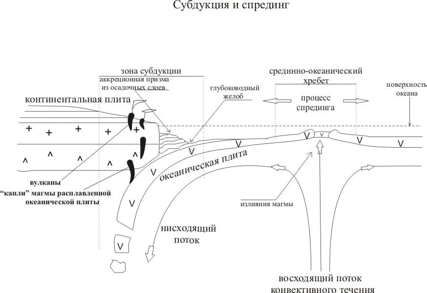 Когда-то я задала вопрос: «Почему континентальная кора имеет гранитный слой, а океаническая – нет?». На что мне преподаватель ответил: «Океаническая кора моложе континентальной.». После такого ответа, я совершенно перестала думать о слоях кор. Ответ геолога меня поразил, у меня это просто не укладывалось в голове, как такое могло произойти. Так вот сегодня хотелось бы немного поговорить о мире геотектоники и о таких процессах как спрединг и субдукция, которые помогут ответить на вопрос почему океаническая кора моложе континентальной. Исходя из теории тектоники плит, все литосферные плиты находятся в постоянном перемещении. Этот процесс обусловлен таким динамическим понятием как «мантийная конвекция», при котором происходит очень медленное ползучее движение твердой силикатной мантии Земли, вызванное конвекционными потоками, переносящими тепло из недр на поверхность планеты. В результате этого литосферные плиты могут как расходиться – за счет чего происходит спрединг -, так и сходиться