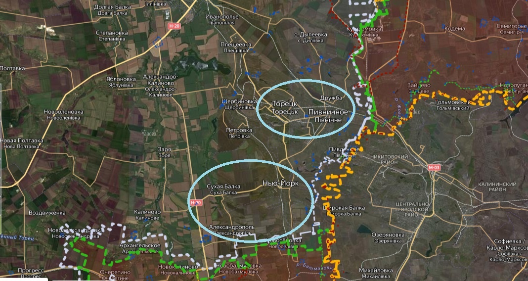 На линии соприкосновения остался единственный участок, где не было никакого движения уже 10 лет, с событий весны 2014 года. Вот на карте эта местность: Участок этот довольно сложный, полно населёнников крупных и малых, переходящих один в другой. В общем, целая агломерация, местный Нью-Йорк. В 22 может у наших сил не хватило тут, может укрепления были слишком хороши, но здесь ничего не сдвинулось. А потом и особых усилий не прикладывалось. Если честно, то отсюда практически не было каких-то новостей. Так вот недавно, может пару месяцев тут впервые за долгое время произошла какая-то активизация, когда небратья попытались взять террикон, а наши им этого не позволили. А так в общем и целом – тишина была. Конечно, небратья периодически беспокоили 155-миллеметровыми местных жителей, но за 10 лет так к такому привыкли, но не смирились, конечно же. И вот вчера в наше распоряжение приходит информация, что тут наши активизировались, лупят со всех стволов, авиация, тяжелая техника. По всем призна