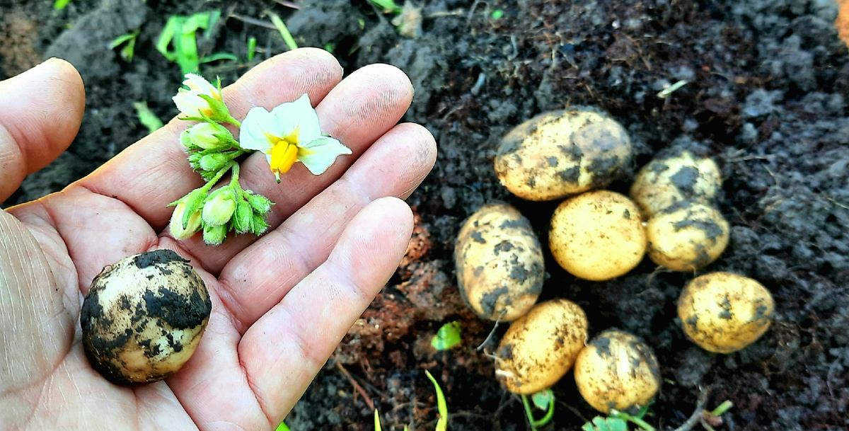 У меня зацвела обычная ранняя картошка. Каков же был соблазн сравнить её с пакетной! Говорят же: цветёт - можно копать молодую. Тем более, у нас же дожди, должна была налиться! Но оказалось, что всё не так однозначно... Хотя в пакете-то у меня не цвела, ботва была меньше, а урожай порадовал. Да, совсем не плохо. И ещё у меня ж осталось три маленьких пакета с картофельной "рассадой", пересаженные в землю. Ну, и вот их результат: в одном пакете была всего одна махонькая картошина - это был совсем другой сорт, не ранний, поэтому развивался он иначе, а с двух пакетных картошин ещё одного сорта получился вот такой "урожай". Однозначно, теперь можно сказать, что на результат влияет: 🌿сорт картошки (лучше ранний) 🌿величина пакета (грунта) 🌿срок посадки 🌿условия прорастания 🌿количество картошин в пакете То есть, если посадить пару-тройку картошин раннего сорта в середине марта в большой пакет, например, и держать дома до приемлемого тепла на улице или в теплице, то к середине июня резул