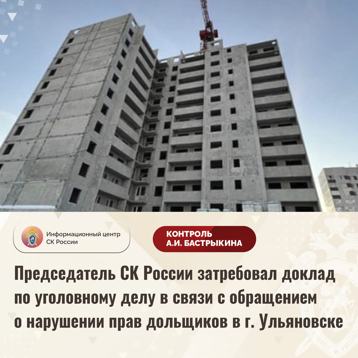 Председатель СК России затребовал доклад по уголовному делу в связи с обращением о нарушении прав дольщиков в г. Ульяновске