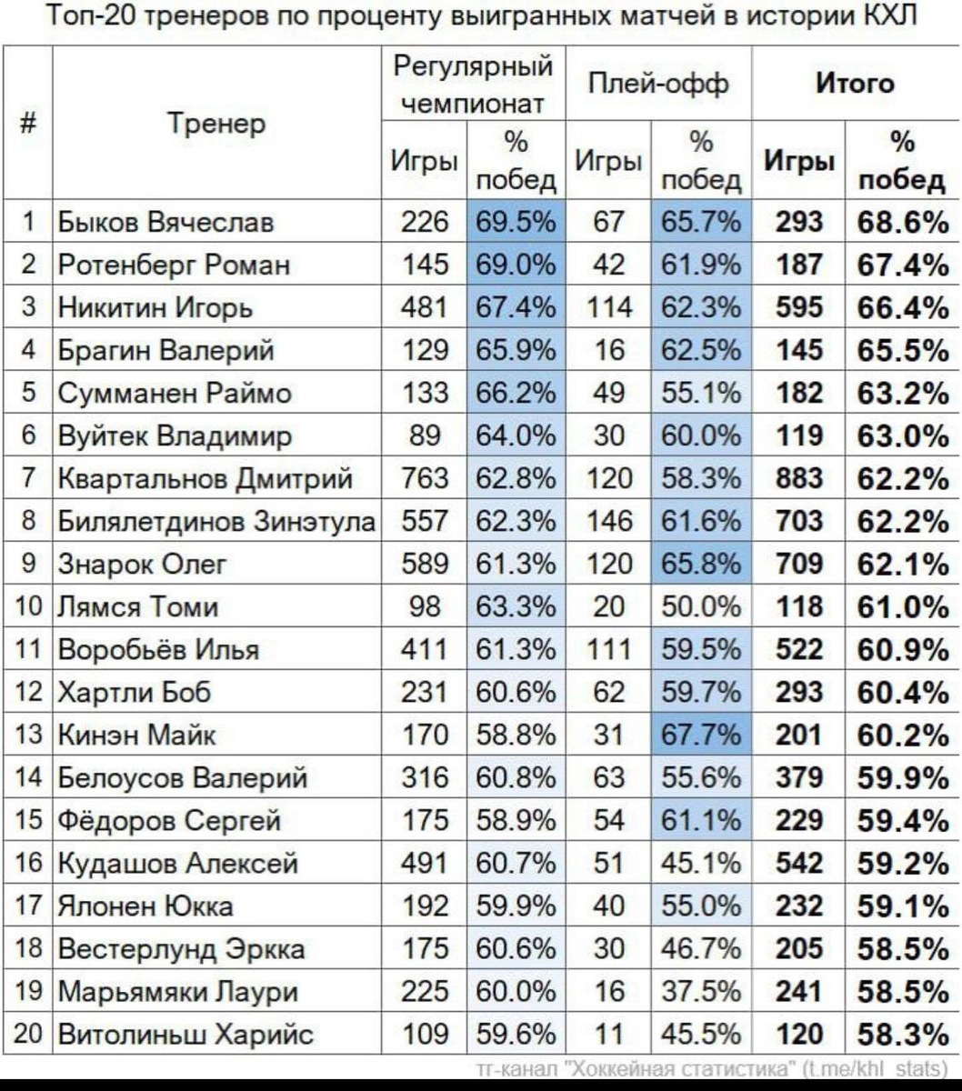 Главный тренер СКА выложил таблицу, в которой представлен топ-20 тренеров по проценту побед в КХЛ. Ротенберг занимает вторую строчку по показателю побед в регулярном чемпионате (69%), уступая Вячеславу Быкову (69,5%). «В КХЛ очень много классных тренеров, много лет работавших и продолжающих работу с клубами и в системе сборных команд России. Для меня большая честь оказаться в компании таких великолепных специалистов, как двукратный чемпион мира Вячеслав Быков, с которым мы выиграли Кубок Гагарина для Санкт-Петербурга в 2015-м, Игорь Никитин, с которым мы работали в сборной России, завоевывали медали, в том числе олимпийское золото Пхенчхана, Валерий Брагин, победитель МЧМ-2011, который продолжает работу в системе СКА, и конечно же Зинэтула Билялетдинов и Дмитрий Квартальнов. Цифры врать не будут: мы год за годом проводим серьезную работу по комплектованию, подготовке команды, учим, что такое победный дух, передаем наши традиции. Все самое главное ждет нас впереди, шаг за шагом движемся