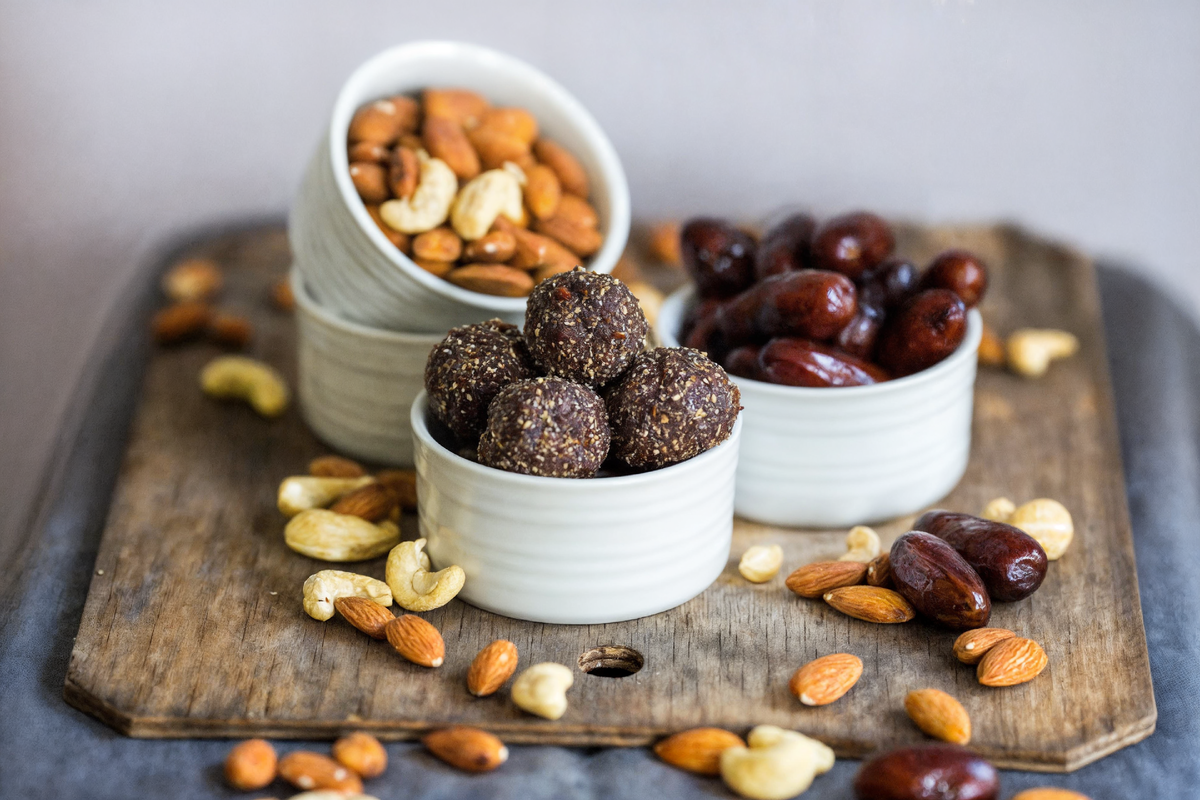 5. В середину каждой конфеты вложить целый миндаль или фундук. Если десерт готовится для маленьких детей, лучше использовать измельчённые орехи. Тогда их надо добавлять вместе с ванилью, мёдом и корицей.