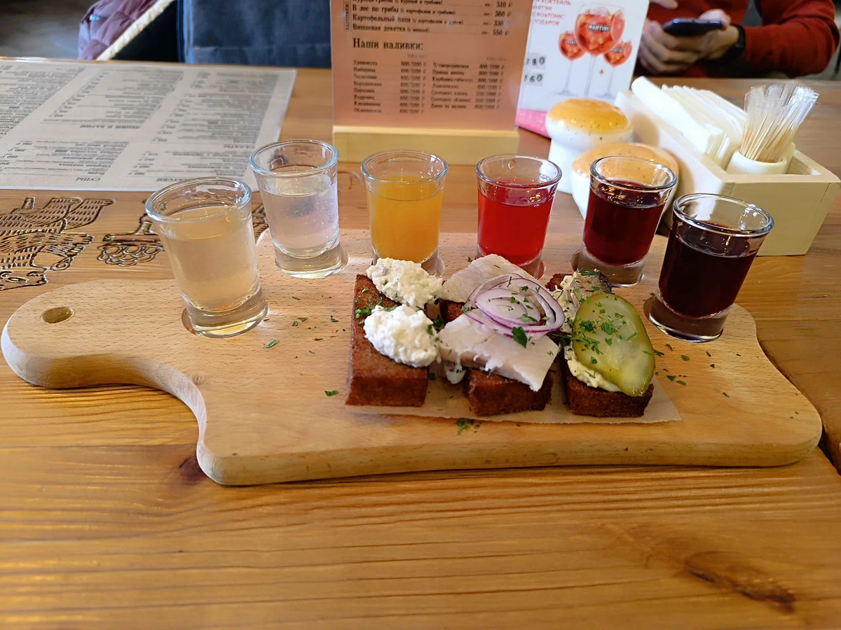 Для интересно выпить и вкусно закусить: Классический сет из шести наливок по 25 мл: хреновуха, имбирная, клюквенная, облепиховая, черносмородиновка и пряная вишня. Сопровождается всё это дело тремя закусочными тостами на тёплом ржаном хлебе с форшмаком, селёдкой с красным луком и шпротой на яичном паштете под солёным огурцом. Второй сет "Будь здоров" из чесночной, перцовой, "Бородинской", клубнично-гибискусовой наливок, спотыкача облепихового и клюквенного закажется уже сам собой. Еще в меню есть наливки лимонная, кедровая и джин на малине. Насчёт закусить имеется форшмак с гренками Сало по-домашнему Разносол И пряная сельдь с картофелем "Сели да Поели", пожалуй, единственное место, где в меню представлен легендарный салат "Клязьма", придуманный специально для маршрута "Золотое кольцо России". Кстати, в Суздале этот салат называется "Архиерейский" по имени Архиерейских палат Суздальского кремля, в которых располагался знаменитый ресторан "Трапезная". Из других салатов интересно попробо