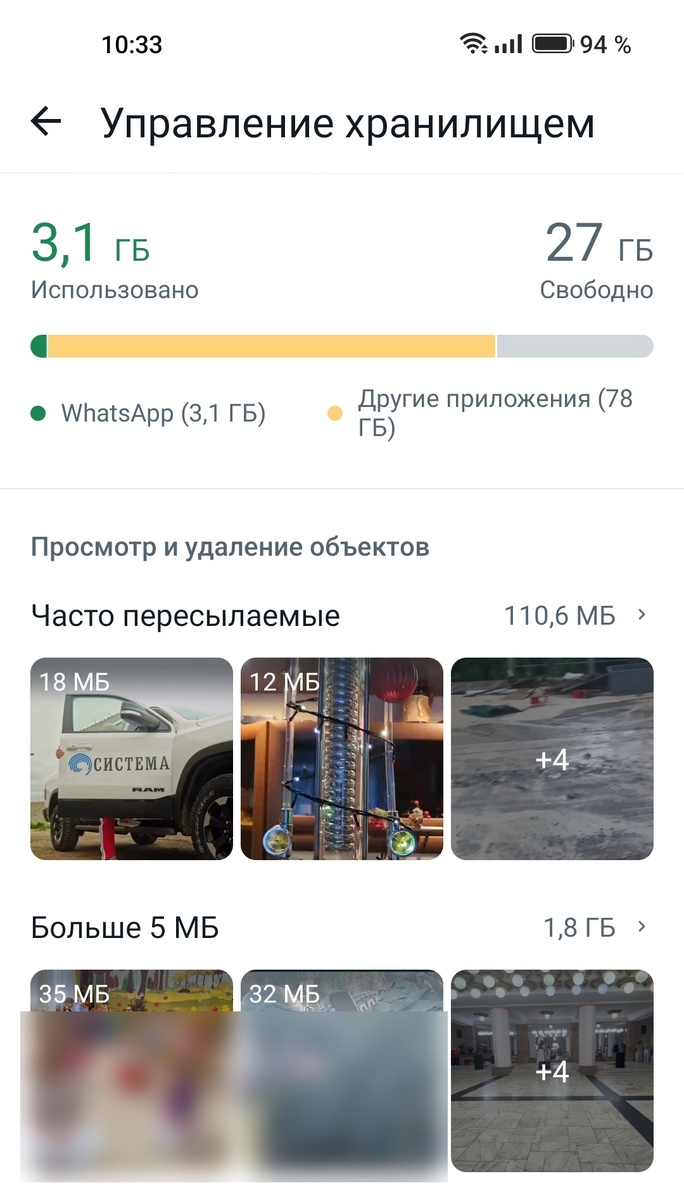 Если на смартфоне заканчивается память, ее можно освободить, удалив ненужные файлы мессенджера WhatsApp. В WhatsApp пользователи часто получают открытки, фотографии, видео, которые сохраняются в памяти и забивают ее. Ненужные файлы можно просмотреть и удалить следующим способом: Здесь будет указан общий вес файлов, которые пользователь получал в чатах. Удалить самые крупные из них можно, если в разделе «Просмотр и удаление объектов» нажать на строку «Больше 5 МБ». Откроется список всех файлов, которые пользователь может удалять по отдельности (удерживать палец на каждом объекте, затем нажать на значок корзины) или очистить все сразу (поставить галочку возле «Выбрать все», затем на значок корзины). В меню «Управление хранилищем» можно удалить и все остальные файлы независимо от их размера. Для этого нужно пролистать вниз и найти список чатов. Если нажать на любой из них, отобразятся все файлы, которые присылал собеседник выбранного чата. Процесс удаления такой же – либо выбирать только