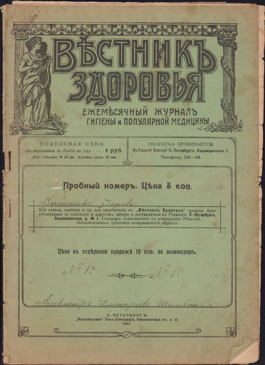 Одним из популярных изданий стал журнал «Вестник здоровья». Пробный номер от 1911 г. хранится в Нижегородском музее-заповеднике, скорее всего его получателем был Александр Дмитриевич Шалявин.