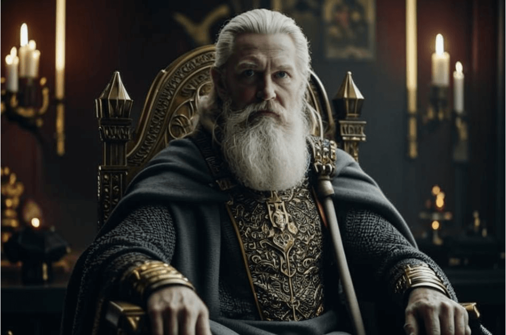 В белокаменном чертоге градоправителя было темно, как ночью. Большие окна были закрыты ставнями. Лишь когда друзья присмотрелись, они заметили, что высокий, стоящий на двух ступеньках, трон пуст. А в углу, на длинной скамье, сидел, сутулясь, старец, который мало походил на государя. Его истинное обличье лишь выдавала одежда. На нем было длинное платье коричневого цвета. Полы его были расписаны белым, зубчатым узором. Из-под них видны были сапоги с загнутыми мысками. На плечи старца был накинут длинный, темно-зеленый плащ с капюшоном. Белые, как снег волосы кудрями спускались до плеч. Голову венчала темная полу корона. Борода была тоже белая, густая и длинная – совсем, как у Маблунга. В своих старческих руках наместник держал меч в ножнах.