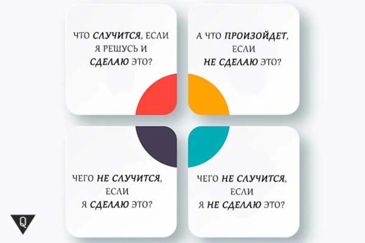 и много других вопрос возникает в нашей жизни. Какое бы сложное решение не стояло бы перед Вами, можно расписать с помощью квадрата Декарда.✅️ Автором данной техники является Рене Декарт – французский философ, физиолог, физик, механик, математик, а также основоположник алгебраической символики и аналитической геометрии и автор философского метода радикального сомнения. Порой необходимо увидеть с другого угла решение своей проблемы, для этого и поможет данная техника. Я и сама ей пользовалась неоднократно. Вам понадобится лист бумаги и ручка, разделите лист бумаги на 4 части (квадрата) в 1️⃣ квадрате ответьте себе на вопрос "Что случится если я это сделаю"?, во 2️⃣ квадрате ответьте на вопрос "А что произойдёт если я это НЕ сделаю?", в 3️⃣ квадрате "Чего НЕ случится если я сделаю это?", и в 4️⃣ квадрате "Чего НЕ случится если я это НЕ сделаю?". Так Вы представите ситуацию в полной мере, даже немного смотря в будущее, какого Вам с этим решением!
