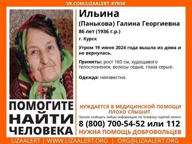Поисковый отряд «Лиза Алерт Курская область» распространил срочную ориентировку на поиски пожилой жительницы областного центра. По данным волонтеров, утром 19 июня пенсионерка вышла из дома и не вернулась. Нуждается в медицинской помощи. Требуется помощь добровольцев в поисках. Поисковую операцию пришлось прерывать из-за объявленной в Курске ракетной опасности. Во второй половине дня поступила информация о том, что пожилая курянка найдена. Она жива. Сергей Яшин, по материалам https://vk.com/lizaalert_kyrsk Постоянный адрес новости на сайте «Друг для друга» ~ https://dddkursk.ru/lenta/2024/06/19/109555/. Новости Курска за ~ 19 июня ~ июнь 2024 года.