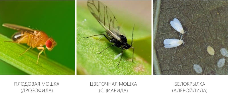 Рано или поздно каждый сталкивается с проблемой появления вредителей-насекомых, которые поселяются на самих растениях или живут в земле. Мелкие насекомые вредители питаются соком и тканями растения, из-за чего цветок перестает расти и цвести, а массовое размножение вредителей может вызвать гибель растения. Цветоводам всегда нужно внимательно осматривать листья, стебли растений и землю, при обнаружении насекомых не откладывая принимать меры по их уничтожению. Легче всего обнаружить летающих мошек, обычно, заметив движение, мошки взлетают, иногда они летают, чтобы найти новое место жительства, например, другой горшок с растением. Чтобы проверить есть ли летающие насекомые вредители на растении, встряхните его, увидев движение, внимательно рассмотрите появившихся мошек. Маленькие черные мошки с прозрачными крылышками и темным тельцем называют грибными или огуречными комариками, а по-научному – сциариды. Во взрослой стадии эти мошки размером 3-4 мм, не столько вредят растениям, сколько дос
