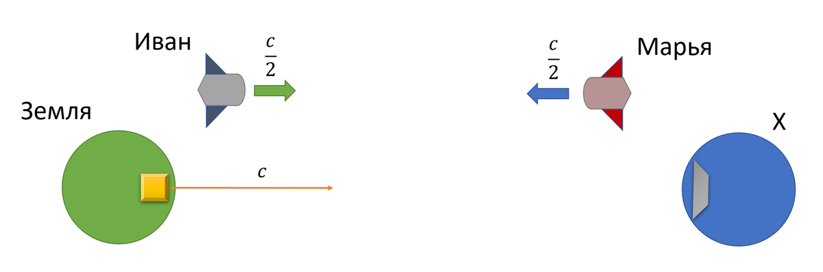 К Марье со скоростью в половину скорости света приближается Земля (зелёная линия). Со скоростью (по релятивистскому закону сложения скоростей) 4/5с к ней приближается Иван (коричневая линия с более горизонтальным наклоном. Ну а свет в любой системе отсчёта в рамках ТО движется с одной скоростью, которая максимальна. Потому красные линии все под одним углом, который по отношению к горизонтали наименьший. Через некоторое время после вылета Иван запрыгнет в корабль Марьи, а затем они благополучно долетят до Земли, где и увидят разбитое Зеркало на планете Х. При этом сам факт попадания луча на зеркало на планете Х происходит после встречи Ивана да Марьи. Подобные построения очень удобны, поскольку не позволяют ошибиться из-за наглядности изображений.