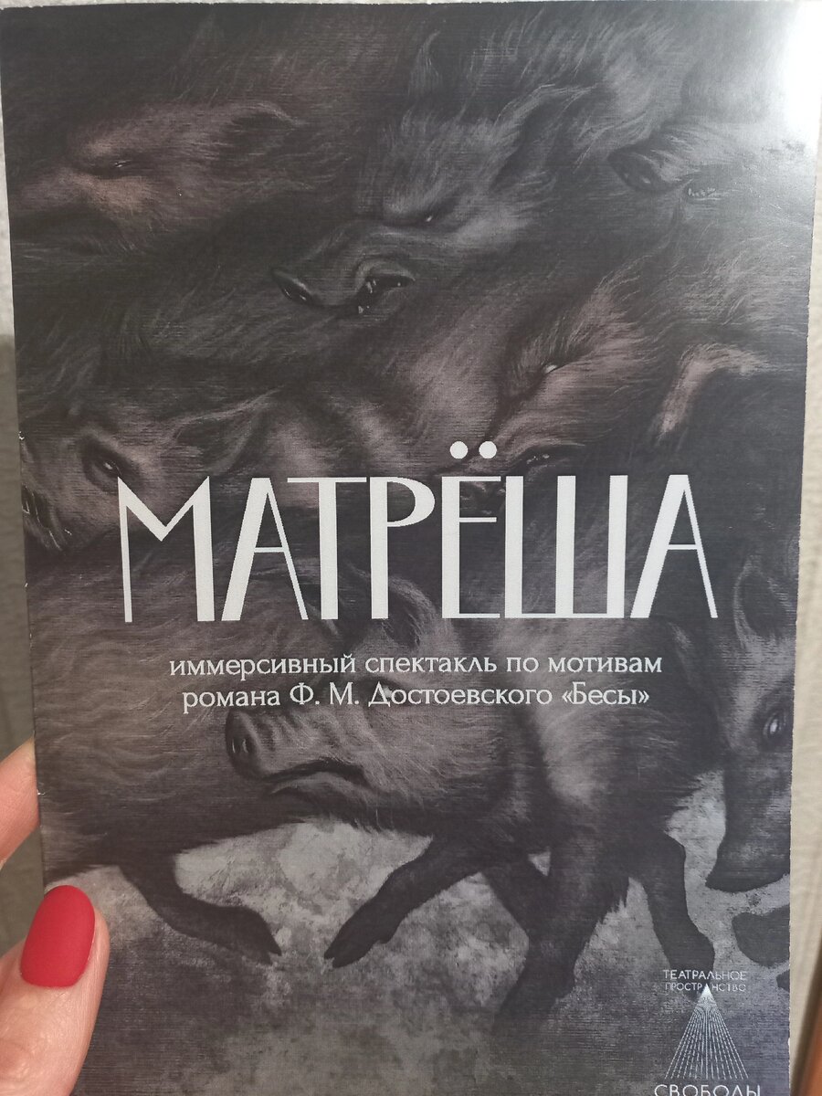 Спектакль показан 11 ноября 2023 г. в рамках XXVII Международного театрального фестиваля Ф.М. Достоевского. "Театральное пространство Свободы Алексея Тетюева" из Челябинска "Бесы" - они же "Матрёша". На фестивале этот спектакль был представлен в иммерсивном формате, сначала на улице возле лектория Новгородского музея заповедника, а затем и в самом лектории. Роман сам по себе морально тяжелый, а в виде спектакля и подавно. Здесь ты не просто зритель, а свидетель всего происходящего ужаса, мракобесия, да так всё натурально было, что ты погрузился в жизнь персонажей, ещё до начала спектакля в толпе со зрителями смешались актёры в образах: то рядом с тобой мечущаяся в поисках или наоборот прячущаяся от кого-то слабоумная девушка, то пьяный дезориентированный молодой человек, и все они как-то взаимодействуют с тобой. А потом с приходом очень харизматичного Беса, ты попадаешь словно в другую реальность, такое ощущение, что с тебя снимают розовые очки, вырывают из твоей почти идеальной жиз