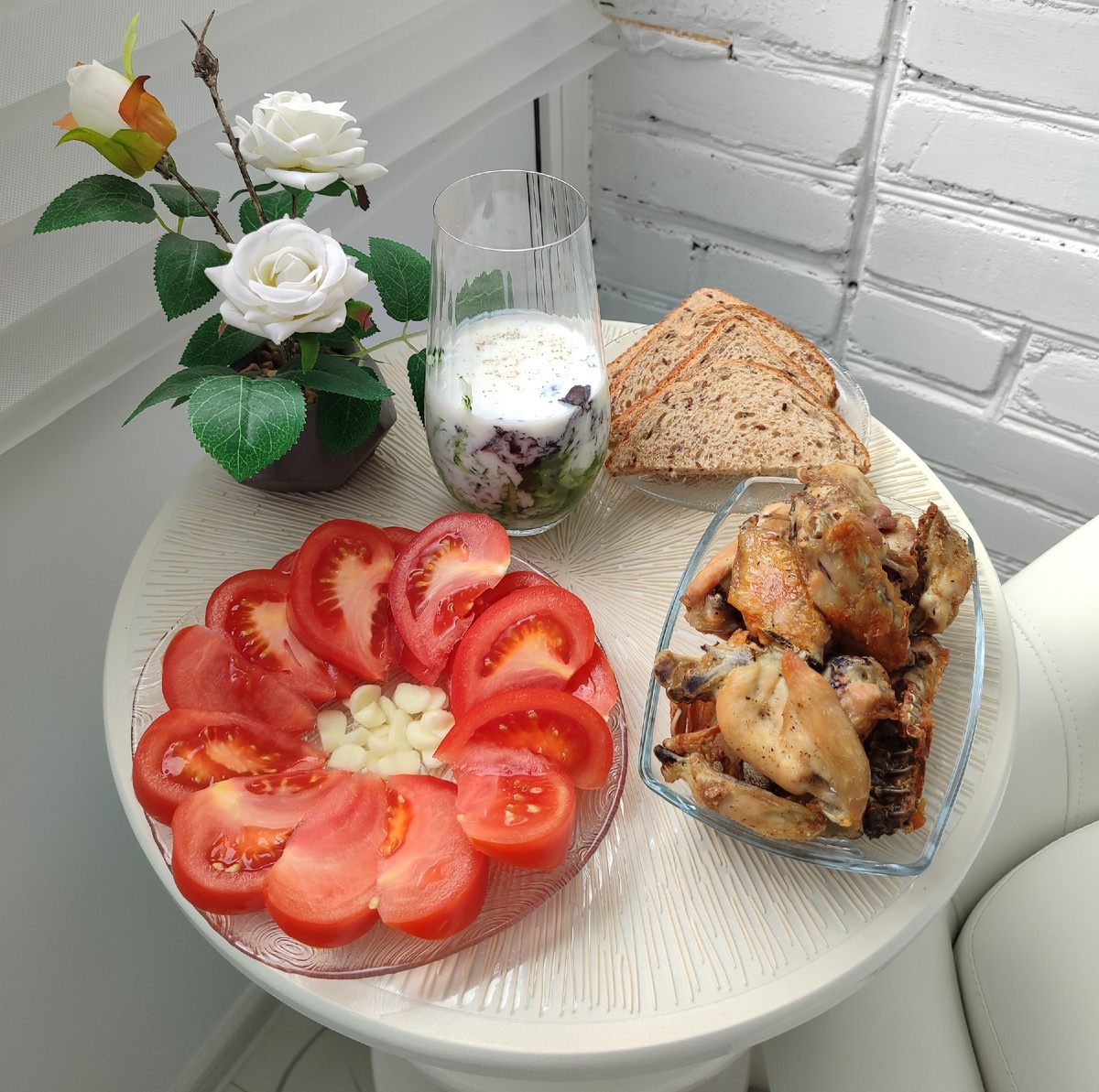 Помидоры и чеснок - прекрасно сочетаются с куриным шашлыком) 2 кусочка полезного хлебушка, порезанные напополам.