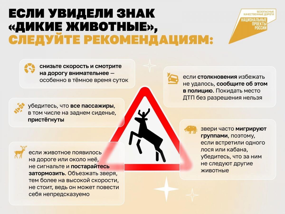 Владимирская область предупреждает водителей об опасности столкновения с дикими животными на дорогах региона. Навигаторы и специальные знаки, установленные по национальному проекту «Безопасные качественные дороги», предупреждают автомобилистов. С начала 2024 года на территории Владимирской области произошло уже 110 аварий с участием диких животных. Водителям следует быть особенно осторожными и внимательными на дорогах области, чтобы избежать встречи с лесными обитателями. Что делать, если вы увидели знак «Дикие животные»: «1. Снизьте скорость! 2. Увеличьте дистанцию до впереди идущего транспорта. 3. Будьте готовы к внезапному появлению животных. 4. Не используйте дальний свет фар. 5. Если столкновение неизбежно, постарайтесь притормозить как можно плавнее», - предупреждает Министерство транспорта и дорожного хозяйства Владимирской области. Ранее «Владимирские новости» сообщали о том, что во Владимире лось спровоцировал аварию. В дикое животное врезалась автоледи. Из-за столкновения пос