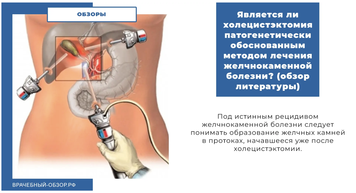 Из сказанного следует, что на вопрос, поставленный в заглавии статьи, с полным правом можно ответить положительно: холецистэктомия действительно является патогенетическим методом лечения желчнокаменной болезни; современная теория литогенеза открывает новые перспективы для увеличения эффективности этой операции с помощью медикаментозных и диетических мероприятий, проводимых в течение длительного времени после ее выполнения.