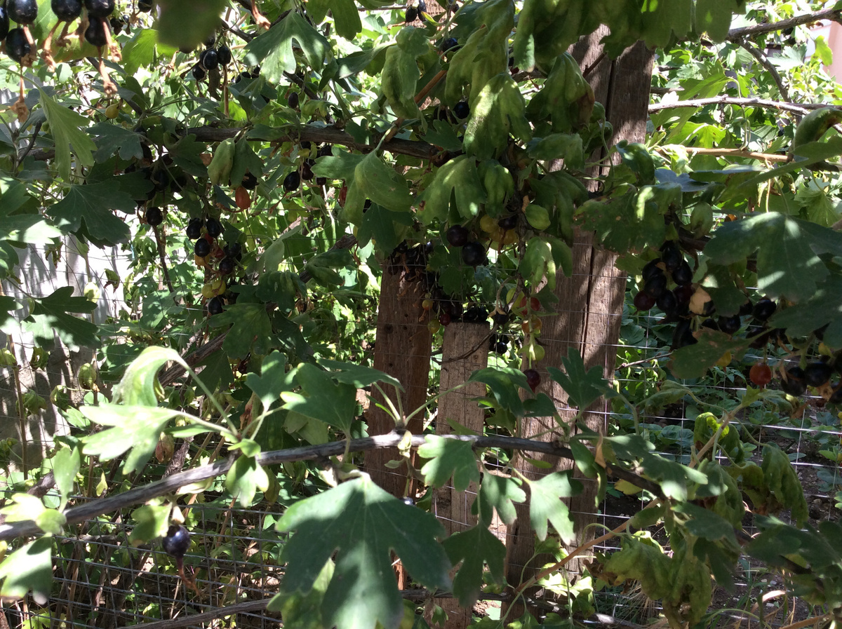 Я уже писала, что, слава богу, нет у нас участка под огород. Так, небольшие кусочки земли. Нет и цели вырастить на пропитание огурцы-помидоры. Понемногу растут ягоды, щавель, зелень и даже несколько кустов помидоров. Если им повезет, то еще и помидорки поспеют) Выжили также два куста огурцов. Крымской, или золотистой смородины в этом году урожай. Несмотря на жару и нечастый полив, ягод море. На фото - уже ободранные кусты и еще нужно рвать. Перебирать эту смородину одно "удовольствие") Разве что под хороший детектив. В общем, перебрала и сварила варенье. Сначала измельчила смородину блендером, потом на каждый килограмм добавила 700 г сахара, проварила и разлила по банкам. Я не думала, что получится такое душистое, вкусное варенье! Густое, как желе. Кстати, смородина золотистая не так болеет, как обычная. Кусты сильно разрастаются, приходится урезонивать, чтобы не зарос весь палисадник. Да наверное, все знают это растение. Весной кусты цветут такими желтенькими цветками, такой арома