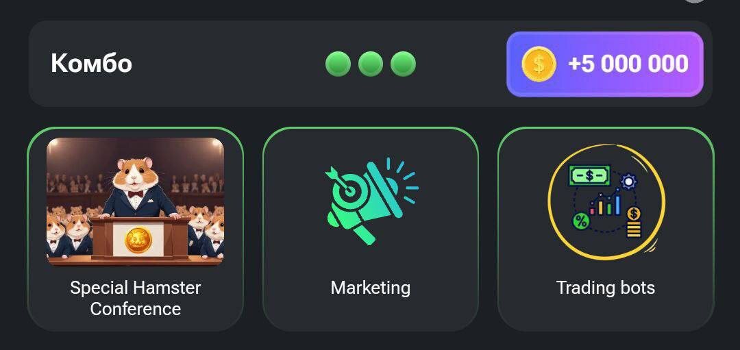 Заходим в приложение Hamster Kombat Нажимаем на "Кирку" (Mine) И в указанных вкладках находим нужные карточки и нажимаем купить. А теперь более детально. Первая карточка во вкладке Markets. Вторая карточка вкладка "PR&Team" Третья карточка во вкладке "Specials" Удачи в заработке!