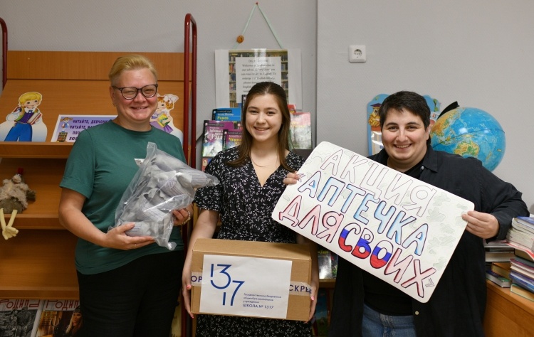 Готовили посылки с гуманитарной помощью к отправке участникам специальной операции заместители директора школы № 1317 Романа Кис (слева) и Лариса Кадырова вместе с выпускницей этого года Дарьей Гоморевой. Фото: Юлия Федотова Акция «Аптечка для СВОих» по сбору медицинских препаратов и расходных материалов для раненых бойцов в зоне боевых действий прошла в начале июня в школе № 1317 района Тропарёво-Никулино. Одна большая семья «Наша школа давно занимается благотворительностью, это всегда было частью нашей жизни, добрые дела объединяют учеников, родителей и учителей в одну большую семью, – рассказывает директор школы № 1317 Венера Глебова. – Помогаем мы и бойцам спецоперации. Июньская акция «Аптечка для СВОих» началась с того, что от матери бойца-медика, жителя нашего округа, мы узнали, что в медсанчасть на передовую нужны расходные медицинские материалы. Объявили сбор и в короткий срок собрали всё необходимое. Отправили ребятам и вкусняшки – печенье, конфеты и другие сладости, потому чт
