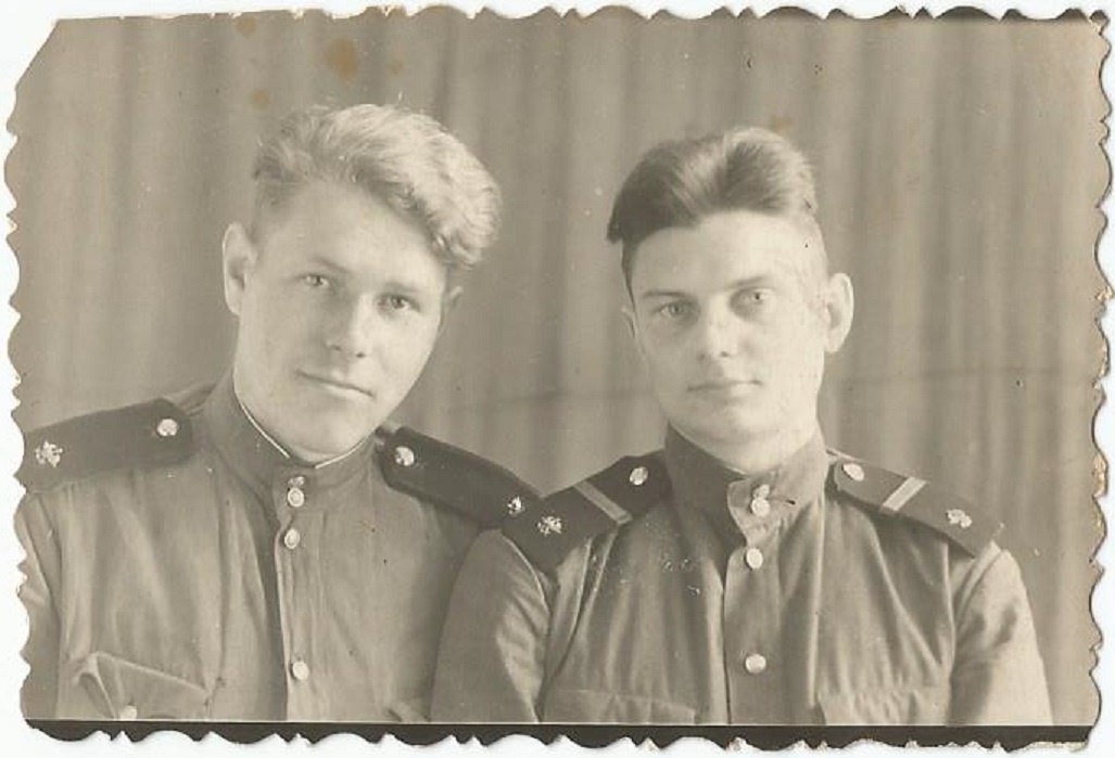 Фотография рядового (слева) и ефрейтора (справа) железнодорожных войск в повседневной форме одежды образца 1943 года. На гимнастерках – погоны, изготовленные по техническим условиям 1947 года. На оборотной стороне снимка имеется подпись: «На добрую память другу Генадию от Сашки и Володи. Вспоминай совместную службу и игру в футбол. Гор. Сучан 20 декабря 1954 г.». Город Сучан в 1972 году был переименован в Партизанск. Этот населённый пункт находится в Приморском крае. По всей вероятности, солдаты, запечатлённые на фото, проходили службу в войсковой части 33014 железнодорожных войск, находившейся в городе Сучан. Это воинское формирование существовало с 1948 по 2010 годы. Фото из коллекции автора. Если вы хотите поделиться своими фотографиями 1930-1990 годов – присылайте их на почту istorikmoskalev@mail.ru, и они будут опубликованы на канале.